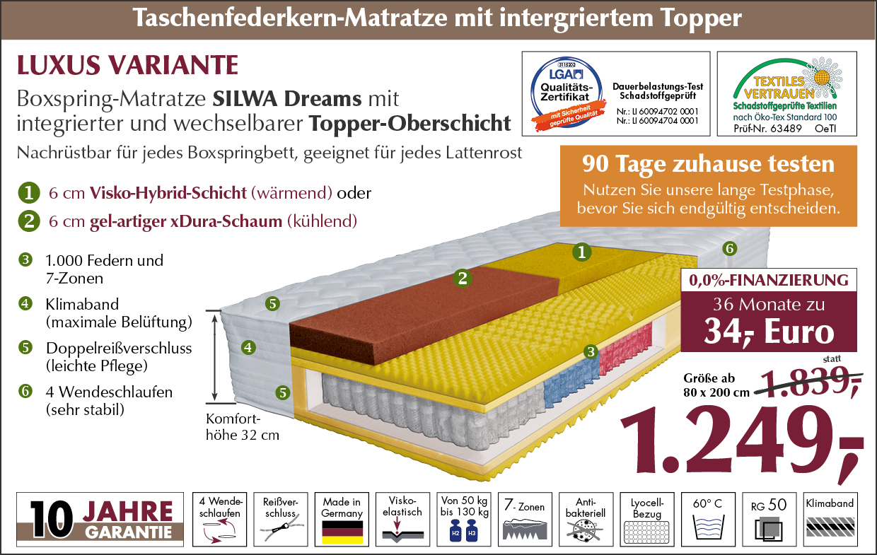 Boxspring-Manufaktur Schleswig-Holstein bis zu 90 Tage Rückgabe PC Liegediagnostik Ergonomische Boxspring Made in Germany bis zu 10 Jahre Garantie